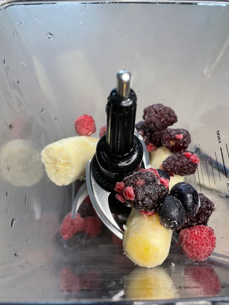 For the next step you don’t need to clean the blended or or even rinse it out, I mean you could if you wanted to, but it would be an extra step that isn’t necessary. You will add the berries, remaining banana, and water to your blender. Blend the berry mixture until smooth, approximately 1-2 minutes.