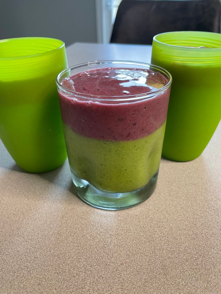Once berries have been completely blended you will add it to your cups. The smoothie should be thick enough that they will be separate layers. My boys love that these look like ninja turtles. They drink up every last drop which makes me a proud mama since it has a lot of vitamins and nutrients!