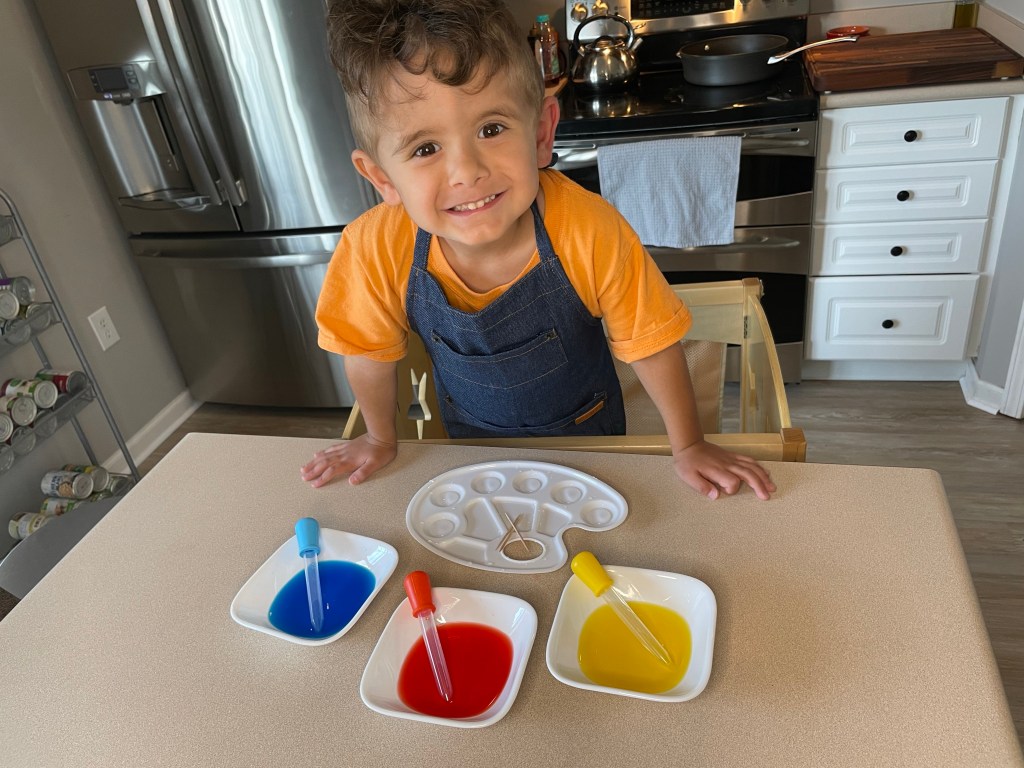 After the color bowls are prepped you can hand the droppers to your little one and let them get to mixing and experimenting!